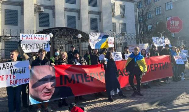 В Киеве под российское посольство вышли националисты в знак протеста против признания Москвой независимости республик Донбасса. Так, под окнами дипведомства собралось до сотни юных радикалов, которые кричали, что «Вам здесь не рады», передает корреспондент «ПолитНавигатора».