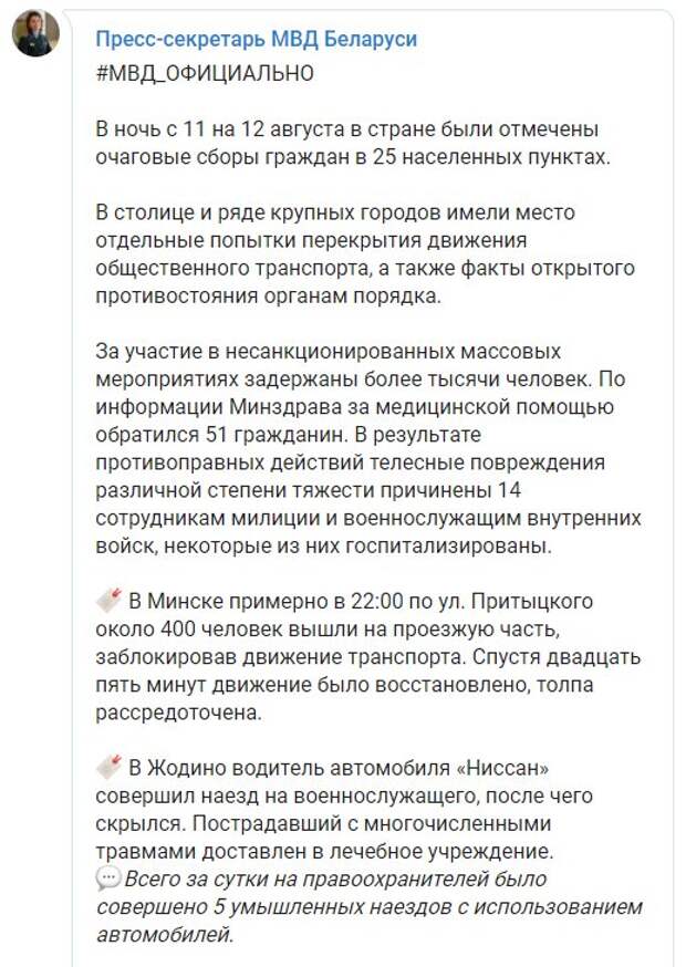 В МВД Беларуси официально подтвердили, что против активистов применялось огнестрельное оружие Как передает Politeka.net, об этом сообщили в пресс-службе министерства. Согласно информации, инцидент произошел в Бресте. "На сотрудников милиции напала группа агрессивно настроенных граждан с арматурой в руках.