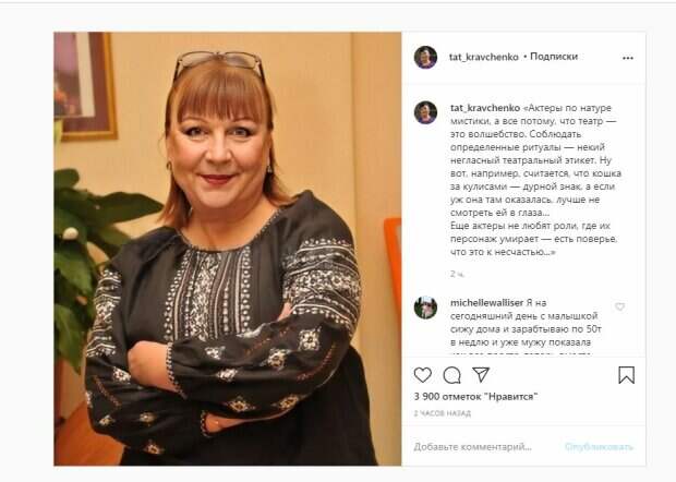 Об этом пишет Politeka.net со ссылкой на страничку знаменитости. «Актеры по натуре мистики, а все потому, что театр — это волшебство. Соблюдать определенные ритуалы — некий негласный театральный этикет. Ну вот, например, считается, что кошка за кулисами — дурной знак, а если уж она там оказалась, лучше не смотреть ей в глаза… Еще актеры не любят роли, где их персонаж умирает — есть поверье, что это к несчастью...», - написала Кравченко. Фанаты поставили почти 4 тысячи лайков и написали комментарии: "Приятная красивая женщина", "вот это я больше еще узнала про черную кошку", "Обожаю её, лучшая, уютная, домашняя, мамочка", "Прекрасная женщина!". Ранее мы сообщали, что российская актриса Татьяна Кравченко, сыгравшая Валюху в сериале "Сваты", впечатлила новым обаятельным образом. "Совсем скоро выходные. Чем планируете заняться? ", - подписала публикацию Татьяна Кравченко. На снимке актриса позирует в легком домашнем образе. На ней можно заметить яркую оранжевую футболку с забавным рисунком, а на голове завязан платок в красный горошек. Напомним, лучезарная Валюха из «Сватов» пленила образом в украинской вышиванке Также Politeka сообщала, что Добронравов внезапно унизил Валюху из "Сватов", такое невозможно забыть А еще Politeka писала, что сияющая Валюха из «Сватов» показала свое настоящее лицо, эффектное фото