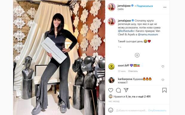 Дополнила ее образ стильная белая сумочка, напоминающая клавиши пианино. Дополняет образ певицы ее стильная стрижка с челкой. На снимках Джамала улыбается и выглядит очень счастливой. «Сначала крутая репетиция шоу, о котором я еще не могу рассказать, потом новая сумка и много украшений. Такой сегодня день», - подписала фото певица. Ее поклонники тут же отреагировали на пост. «Как вы похудели!», «Вы очаровательны! Но какая то сумасшедше нереально красивая студия! Что это?», «Светитесь изнутри», «А чё это ты такая худая?», - пишут люди. Ранее мы писали, что Джамала выложила на своей странице серию фото, сделанных в перерыве между работой. Она предстала в свободной черной кофте и экстравагантных сережках, напоминающих бельевые прищепки. Исполнительница также сделала себе вызывающий макияж с блестящими тенями на веках и роскошную прическу с завитыми волосами. Напомним, сверкающая Джамала пошалила с подругой-красоткой, кадры закулисья облетели сеть: "Соскучилась...". Как сообщала Politeka, Джамала в бесформенной одежде заявила о неожиданном результате своей диеты: "Вишенка на торте!". Также Politeka писала, что игривая Джамала показала, что скрывает за широкой одеждой: "Мечтай".