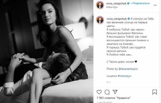 Я милуюся тобою, як чорно-білими фільмами Фелліні. Я захоплююся тобою, як очі захоплюються гірськими піками і заходами на Амалфі. Я пишаюся тобою, як пишаються своїми дітьми. Я Люблю тебе, як... З твоїм днем, мила", - написав шоумен в мікроблозі. Зворушливу публікацію Володимир Остапчук доповнив спільним чорно-білим знімком, на якому шоумен лежить на колінах нареченої і закохано дивиться на Христину. "Дякую, люблю", - відповіла Христина на зворушливе привітання. "Такі душевні рядки"," з Днем народження, Христина", " як красиво...", "Заздрю", "Ідеальні", - продовжили шанувальники в коментарях під постом. Як відомо, у Остапчука підтвердився Китайський вірус і він довгий час проводив вдома, лікувався і самоізолювався. Після того, як недуга відступила, Остапчук вирішив розповісти українцям, як хвороба протікала у нього. "По прильоту зі Львова вранці різко стає погано, озноб, кашель і моторошна ломота у всьому тілі. Лягаю спати на пару годин, температури немає", - розповів телеведучий про перший день хвороби. В цей же день артиста відвезли на швидкій в лікарню, де йому діагностували двосторонню пневмонію. В цей же вечір у нього почався задушливий кашель. За словами Остапчука, найжахливішими днями були дні з другого по п'ятий. Нагадаємо, що Остапчук вперше розповів про свій страшний діагноз і розбурхав: "я не вийшов...". Як повідомляла Politeka, коханка осідлала Остапчука в образі медсестри і змусила червоніти: "увійшло, як по маслу". Також Politeka писала, що Володимир Остапчук розкрив причину сварок з коханою: "ходжу, як ображений хлопчик".