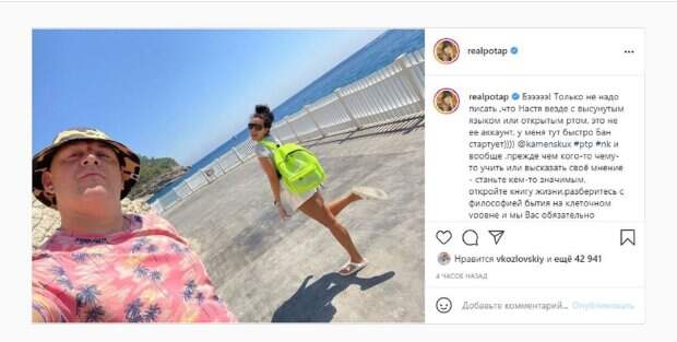 Не забывает Потапенко и о социальный сетях, где делится самым интересным. На фото Потап делал селфи, снимая себя и Настю, которая задрала одну ножку и открыла рот. Интересно, что красотку часто ругают за высунутый язык или просто открытый рот, поэтому Алексей решил защитить возлюбленную, пригрозив украинцам баном, а также рассказав, что нужно им сделать: "И вообще ,прежде чем кого-то чему-то учить или высказать своё мнение - с таньте кем-то значимым, откройте книгу жизни". Итальянская актриса Наташа Стефаненко сразу прокомментировала публикацию: "Обожааю тебя, Потап". Напомним, приемная дочь Потапа в крошечном купальнике померялась формами со своей молодой мамой А еще Politeka писала, что Потап оказался в постели с соблазнительной блондинкой, реакция Каменских не заставила себя ждать Также Politeka сообщала, что бывшая жена Потапа Ирина Горовая в мини-бикини впечатлила формами в бассейне