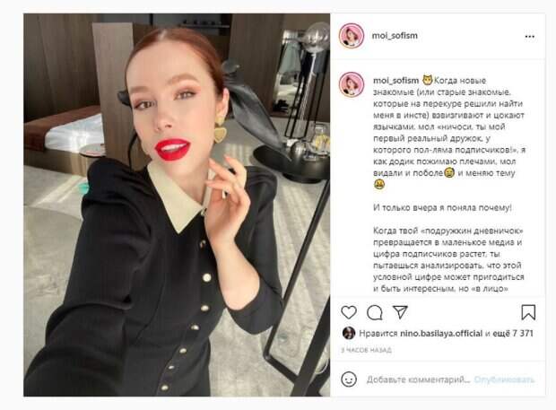 В этот раз Соня опубликовала фото, на котором позировала в платье, а образ дополнила ярким мейкапом. Красотка снимала себя на телефон, впечатляя идеальностью. "Когда новые знакомые (или старые знакомые, которые на перекуре решили найти меня в инсте) взвизгивают и цокают язычками, мол «ничоси, ты мой первый реальный дружок, у которого пол-ляма подписчиков!», я как додик пожимаю плечами, мол видали и поболе, и меняю тему И только вчера я поняла почему! Когда твой «подружкин дневничок» превращается в маленькое медиа и цифра подписчиков растет, ты пытаешься анализировать, что этой условной цифре может пригодиться и быть интересным, но «в лицо» знаешь только маленький процент реальных знакомых и еще горстку читателей, которые регулярно комментируют и активно задают вопросы — это обычно одни и те же люди", - написала Соня. Фанаты поставили тысячи лайков и написали комментарии: "Боже, кто это такая красотка?", "Какая шикарная", "Как всегда прекрасная", "Ты оригинальная". Напомним, Плакидюк из "Супер топ-модель по-украински" устроила урок безупречного мейкапа Также Politeka писала, что Плакидюк из "Супер топ-модель по-украински" в необычных вышиванках покорила украинцев А еще Politeka сообщала, что Плакидюк из "Супер топ-модель по-украински" показала себя после долгого дня на ногах, растрогав Полякову