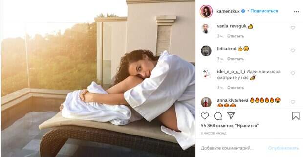 Знаменитая украинская певица Настя Каменских показала идеальное утро на роскошной террасе Как известно, стройная Настя Каменских любит баловать фанатов жаркими кадрами со своей жизни, хвастаться сменой имиджа и показывать, как проводит свои будни с супругом Потапом. В этот раз звезда восхитила домашним образом в белоснежном халатике, позируя с мокрыми волосами.