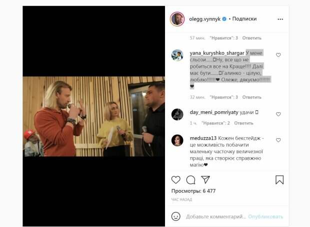В своем Инстаграм Винник нередко делится фото с проекта, в частности и репетиции. (Чтобы посмотреть видео, доскролльте до конца страницы) В этот раз певец решил показать, как проходила подготовка к полуфиналу, когда в его команде еще была Галина Куришко. Видно, как Винник помогает и наставляет своих участников, позже присутствовал на генеральной репетиции и выступлении, и после решения о том, что Куришко должна покинуть проект. "Я сейчас очень сильно ранимый... сильно...больно. Разделяют на хорошее и хорошее", - признался Олег, едва сдерживая слезы. В посте певец написал: "За кулисами полуфинала [Голос країни] Ваша любимая рубрика # кадром