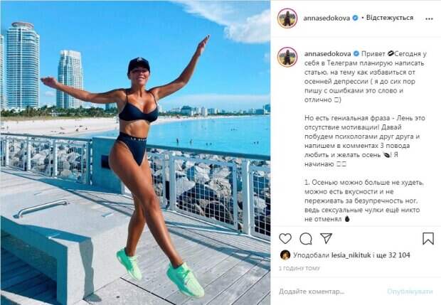 Знаменитая украинская певица Анна Седокова похвасталась впечатляющей фигурой Артистка показала новое фото в Инстаграм, передает Politeka.net. Седокова рассказала, что готовится написать статью о том, как избавиться от осенней депрессии. Пока готово немногое, но певица решила поделиться несколькими пунктами: 1.