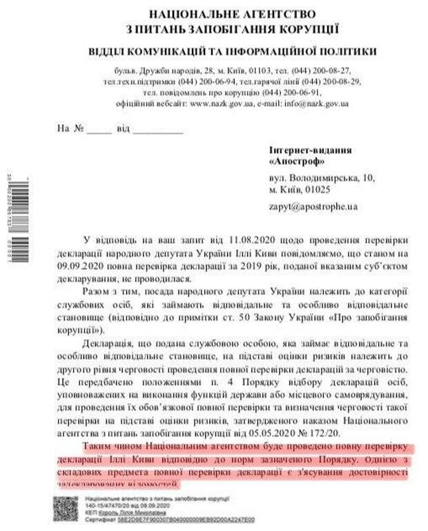 В декларации Кива указал, что яму сдает по 100 тысяч грн в месяц ООО "Сиквел". Эта фирма фигурирует в уголовном производстве как фиктивная. Ее глава Светлана Стависюк комментировать сделку отказалась, сославшись на "коммерческую тайну". В ноябре 2019 Кива яму продал, однако в декларацию сведения об этом не внес. В расследовании указано, что официально Кива живет в однушке на Харьковском массиве столицы - его бесплатно приютил муж его пресс-секретаря. Но соседи Киву не видели: квартира закрыта несколько лет. В материалах одного из дел с участием нардепа местом его проживания указано общежитие на ул. Бажова, 12, где его также не видели. Как указали журналисты на самом деле он арендует квартиру на ул. Лютеранской в центре Киева. Журналистам Кива заявил, что тут живет его подруга, с которой у него "общий секс", но не имущество. "Апостроф" направил в правоохранительные органы запросы относительно декларации Кивы, его имущества и разрешений на специальные номерные знаки на авто охраны. В НАПК сообщили, что собираются провести "полную проверку" декларации Кивы. В НАБУ вопрос отказались комментировать, сославшись на тайну следствия. От МВД пришел ответ из Нацполиции, о том, что такие сведения подпадают под действие закона о защите персональных данных. Журналисты отметили, что также ничего неизвестно о прогрессе по делу с дракой Кивы и ветерана АТО в центре Киева, или о рейдерских захватах агропредприятий якобы его людьми (нардеп может быть связан с серией рейдерских нападений в Кировоградской и Херсонской области). Также Киву обвиняли в контрабанде через линию разграничения на Донбассе. В 2015 он возглавил департамент МВД по борьбе с наркопреступностью, и его подчиненные утверждали, что он "тормозил" расследование крупных дел и мог быть причастен к работе сети распространения наркотиков в ночных клубах, подпольных казино в Киеве. "Обделенный вниманием правоохранительных органов, Кива сполна компенсирует это в СМИ и Верховной Раде. Нардеп не покидает студии каналов Медведчука, устраивает акции в поддержку Лукашенко в парламенте, торпедирует НАБУ через Конституционный суд. С мандатом - как с зачеткой в университете. Первый год депутат работает на мандат, следующие четыре - мандат на депутата", - говорится в материале.