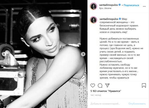 «Когда мы пытаемся следовать уже созданным правилам – оказывается, что это не приближает нас к счастью, а делает путь к нему еще более запутанным. Возможно, потому, что это не наши правила?... Прежде чем слушать десятки других голосов – пусть и говорящих хорошие и правильные вещи – я бы хотела, чтобы каждый из нас прислушался к себе. Всегда. В любой ситуации», - написала певица. Она также поделилась серией своих новых черно-белых фото. На них Санта позирует в танцевальном платье с короткой юбкой и глубоким декольте. Несмотря на отсутствие цвета на фото, образ певицы выглядит ярким и праздничным. Поклонники Димопулос бурно отреагировали на ее пост. «Невероятная», «Вы очень умная женщина, хорошие слова», «Нефертити», «Красотка», «Шикарная», «Очень мудрые слова», «Нежная красавица и умница», - пишут люди. Ранее Димопулос рассказала, что при подготовке к новому выпуску она целую неделю «едва успевала дышать». «Растяжка, правильное дыхание, куда идет рука, куда нога… куда иду я?! Я иду навстречу новой себе. Такой собранной, отдающейся процессу и увлеченной тем, что я делаю, – я еще не была. «Танцы…» открывают мне новую меня, новые границы моих собственных возможностей, о которых я даже не подозревала… Это новая Санта, с которой я только знакомлюсь», - рассказала экс-солистка ВИА-Гра. Напомним, Димопулос и Мейхер из "Танців з зірками" высказали все, что думают друг о друге. Как сообщала Politeka, знойная Санта Димопулос поразила откровением о «Танцях з зірками»: «Я даже не подозревала…». Также Politeka писала, что фаворитка Кухар из "Танців з зірками" Димопулос свела с ума рельефами в смелом платье.