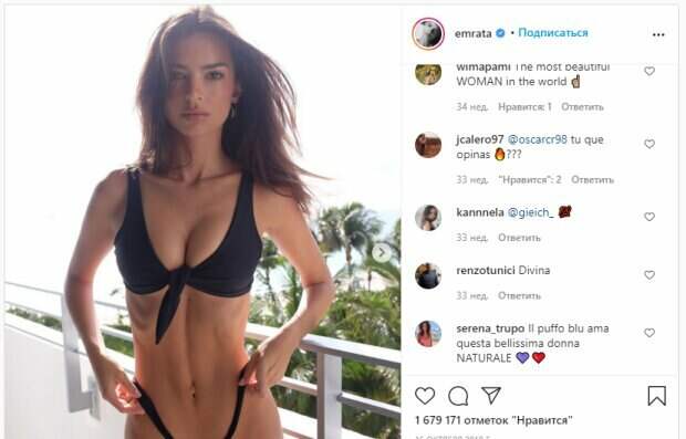 Об этом пишет Politeka.net со ссылкой на фан-страничку знаменитости. Фанаты поставили немного лайков и не писали комментарии под публикацией. Сообщалось, что знаменитая супермодель Эмили Ратаковски показала идеальный пляжный образ в черном бикини. На фото Эмили также видно, что девушка не сильно любит аксессуары, на отдыхе она блистает лишь с аккуратными украшениями и делает акцент на идеально плоском животике. В черном купальнике Ратаковски показала всем лучшую форму: "Какой плоский животик!; можно просто сгорать от роскоши; Sei troppo bella; Красивы ты и твой пупок; Ты такая вкусная, почему так тесно; Совершенство - это скучно, но в этом случае я бы занимался этим неделю или две", - пишут пользователи. Мы писали, что знаменитая модель, начинающая актриса и бизнесвумен Эмили Ратаковски показала новый вид в стильном бикини. На фан-аккаунте также появилось такое фото, на котором Эмили без укладок, яркого макияжа и в одном купальнике покорила всех. Монокини насыщенного бирюзового оттенка удачно показало бюст девушки – вырез на груди продемонстрировал «лучшие стороны» Эмили во всей красе. Напомним, Ратаковски разожгла страсть в приспущенном халатике без белья, размеры впечатляют А еще Politeka сообщала, что Ратаковски приковала взгляд к своим внушительным размерам в бесстыжей маечке Также Politeka писала, что Ратаковски побаловала своими сочными объемами в слишком смелом декольте