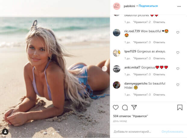 Большая часть кадров Хильде сделана при этом на пляже или дома, так как звезда предпочитает устраивать съемку на комфортной для нее территории. На фан-аккаунтах в Инстаграм также можно увидеть множество пикантных фото. На одном из фото модель позировала в светлом купальнике небесно-голубого оттенка без принтов и украшений. Образ Хильде для отдыха на пляже дополнили лишь серьги-кольца, повязка для волос и макияж с естественным эффектом. Вот что пишут в сети: «Невероятная женщина