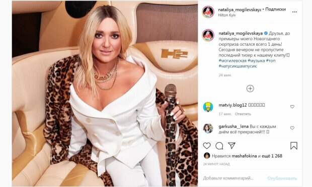 Наряд оголял плечи звезды, а из красивого декольте выставился бюст звезды. Золотые цепочки сияли на шее, привлекая внимание. Звезда была в леопардовой шубке, которую спустила с плеч. В руках Могилевская держала леопардовый микрофон "Друзья, до премьеры моего Новогоднего сюрприза остался всего 1 день! Сегодня вечером не пропустите последний тизер к нашему клипу!