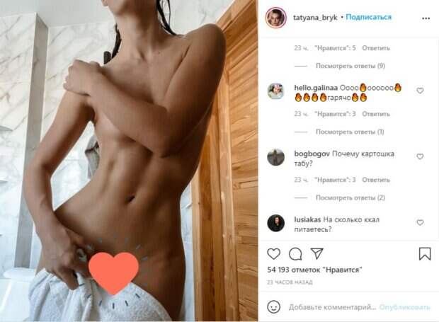 Под пикантным фото без одежды и прикрываясь одним полотенцем, модель рассказала о своих правилах, которые помогли ей наладить режим и сбросить лишнее. По словам Брык, ее часто спрашивают именно об этом. «Сейчас я практически в том теле, котором хочу быть. В своей жизни я проходила через многое: и голодовки, и жесткие диеты и даже иголки в уши вставляла... но что действительно помогает лично мне - правильный контроль. Раньше я взвешивала еду и подсчитывала ккал. Придерживалась нормы, сейчас же я очень просто на глаз могу померять сколько примерно ккал», - рассказывает Татьяна. Теперь у нее последний прием пиши в 4-5 часов вечера, а первый - в 5:45-6:00 утра. Девушка практически не употребляет молочную продукцию и ест мало мяса. Больше она ест рыбу и морепродукты. «На ужин я могу съесть хурму или гранат . В общем что-то легкое хотя фрукты не рекомендуют после 3х дня. На обед чаще всего греча с рыбой, спринг-ролл или подобное. На самом деле, сейчас в моем рационе преобладают овощи» - рассказала модель. «Слишком откровенно; На сколько ккал питаетесь?; Боже какая же вы красивая