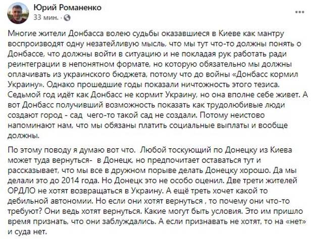 Однако прошедшие годы показали ничтожность этого тезиса. Седьмой год идёт как Донбасс не кормит Украину, но она вполне себе живет. А вот Донбасс получивший возможность показать как трудолюбивые люди создают город-сад - чего-то такой сад не создали. Потому неистово напоминают нам, что мы обязаны платить социальные выплаты и вообще должны. По этому поводу я думаю вот что. Любой тоскующий по Донецку из Киева может туда вернуться - в Донецк, но предпочитает оставаться тут и рассказывает, что мы все в дружном порыве делать Донецку хорошо. Да мы делали это до 2014 года. Но Донецк это не особо оценил. Две трети жителей ОРДЛО не хотят возвращаться в Украину. А ещё треть хочет какой-то дебильной автономии. Но если они хотят вернуться, то почему они что-то требуют? Они ведь хотят вернуться. Какие могут быть условия. Это им пришло время признать, что они заблуждались. А если признавать не хотят, то на «нет» и суда нет. Напомним, Романенко рассказал, чем заплатит Зеленский за продвижение комиков в мэры: «Пойдет по стопам…» Как сообщала Politeka, Юрий Романенко о скандале с КСУ: "Ситуация может печально закончиться для Зеленского" Также писали, что Юрий Романенко выскзался о патриотических манипуляциях вокруг возвращения Донбасса: "Ну не идиоты? "