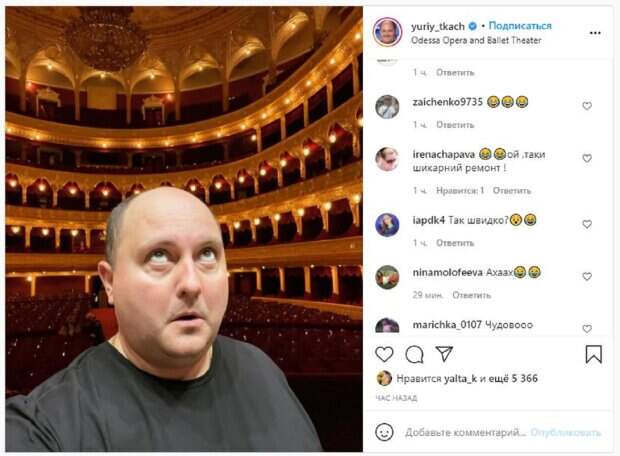 В этот раз в Инстаграм Юрий опубликовал фото из Одесской оперы. Мужчина стоял в большом зале, демонстрируя роскош исторического здания. "Сделал в зале ремонт. Как вам?", - сразу пошутил Юрий в подписи к фото. Фанаты сразу засыпали снимок лайками и написали комментарии: "Шикарный зал", "Нормальный ремонт сделали", "Бедненько, но чистенько", "По-богатому", "Йоперный театр, какой ремонт", "Ой, таки шикарный ремонт", "Так быстро?", "Юра, красиво, молодцы", "Я думаю, что перестарались", "А в спальне сделайте Венецию", "Если долго смотреть, глаза назад не вернутся!!!!!". Сообщалось, что известный украинский комик Юрий Ткач похвастался шедевром своей дочки для музыканта Сергея Бабкина. В этот раз артист показал, как его дочь сделала сладкий подарок собственными руками. Кадры со встречи Сергея Бабкина и "крошки Лиззи" Юрий Ткач показал на своей странице в Инстаграм. Напомним, Ткач из "Квартал 95" похвастался успехом 6-летней дочки и показал ее главного поклонника А еще Politeka сообщала, что Ткач из "Квартал 95" покривлялся рядом со своей веселой супругой, совместное фото Также Politeka писала, что Ткач из "Квартал 95" насмешил неожиданным аксессуаром для своей лысины