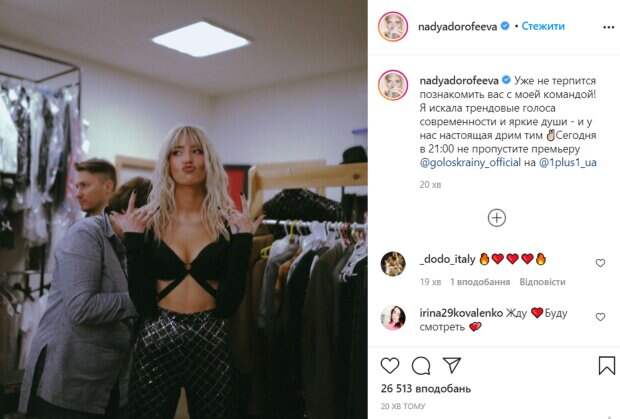 "Уже не терпится познакомить вас с моей командой! Я искала трендовые голоса современности и яркие души - и в мы настоящая дрим тим. Сегодня в 21.00 не пропустите премьеру", - написала она. Эту новость певица дополнила ярким фото, на котором она показывает жестами "рок" и позирует в экстравагантном наряде, оголив живот. В комментариях поклонники Дорофеевой засыпали ее комплиментами и признались, что очень ждут на премьеру. Под новым постом оставил комментарий и другой тренер - Монатик. "В ожидании фото с Димой", - написал он, вероятно, имея в виду самого себя. Другие пользователи соцсети также сказали, что с нетерпением ждут выпуск. "Крутая", "Жги", "Дорофеева, мы за тебя", "Самый крутой тренер", "У самого крутого тренера самая крутая команда", "Какая ты классная", "Невероятная красота", - пишут в комментариях. Напомним, Дорофеева в "сеточке" вызывающе расставила ноги, обратившись к публике. А еще Politeka сообщала, что красавица-двойник Дорофеевой взбудоражила фантазии сочным лакомством. Также Politeka писала, Могилевская и Дорофеева устроили "жару" в соблазнительных нарядах