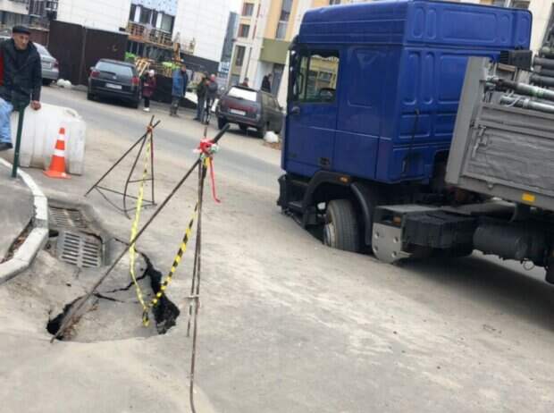 В Киеве грузовик провалился под асфальт в одном из дворов Об этом сообщает Politeka со ссылкой на "Киев Оперативный". Так, в столице вблизи с ЖК "Нивки-парк" на проспекте Победы, 67, грузовик провалился в яму, которая образовалась из-за прорыва отопления. На опубликованных кадрах видно, что колеса фуры "ушли" под асфальт.