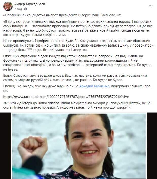 "Я хочу попросить милицию и войска помнить о том, что они - часть народа. И попросить своих избирателей: предотвращайте провокации, не нужно давать повод к применению к вам насилия. Я знаю, что белорусы проснутся завтра уже в новой стране, и надеюсь на то, что завтра будут только хорошие новости", - сказала она. Муждабаев отметил, что "хороших новостей не будет", потому что со стороны Тихановской было "трусливо заранее записать отважных белорусов, которые готовы физически бороться за свободу, за свою независимую Родину, в провокаторы". По словам журналиста, такая позиция Тихановской является "подлостью и предательством". "Итак, этих настоящих людей брошено под каток насилия и репрессий, без надежды даже на формальную поддержку этой "оппозиционерки". Впрочем, от жены крымнашиста я и не надеялся на другое поведение, а они с мужем — резервный вариант для Кремля. Ибо чудес не бывает", - написал Муждабаев. Он также выразил уверенность, что изменить ход истории к новой мировой войне могут только выборы в Соединенных Штатах, "если слуга Путина там потерпит поражение". "А если не потерпит, то и не о чем говорить", - добавил журналист. Напомним, "Дома сидеть надо": силовики в Минске не щадят никого, Тихановская заявила о переговорах с Лукашенко. Как сообщала Politeka, Майдан охватил Беларусь: люди сошлись с ОМОНом, в ход пошли гранаты, кадры восстания. Также Politeka писала, что Майдан в Беларуси набирает обороты, бойцы Омона давят людей на машинах: кадры новых столкновений.