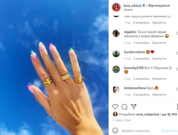 Известная украинская телеведущая Леся Никитюк засветила колечко на безымянном пальце Как пишет Politeka.net, у себя в Инстаграм Леся показала свой свежий маникюр с разноцветными ногтями. Телеведущая сняла свою руку, на которой красовалось три массивных кольца. Одно из них было надето на безымянный палец.