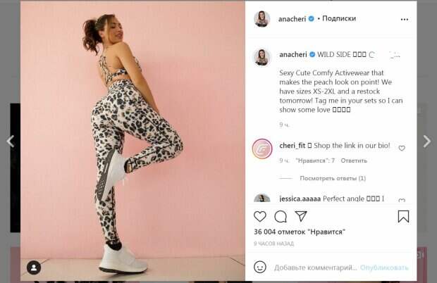 Ана надела топик с красивым плетением на спине. В результате оголилась спинка. Также модель надела леопардовые лосины, обтянувшие ее упругие ягодицы. Пятая точка притягивала взгляд. Белоснежные кроссовки отлично подошли к горячему образу. Модель собрала волнистые волосы в хвостик, выпустив у лица ровные пряди. Она улыбалась, прикрыв глаза, будто наслаждаясь собой. В посте Ана анонсировала выход новой коллекции одежды. За девять часов публикация собрала более 30 тысяч лайков и много комментариев. Пользователи сети написали много комментариев, посвященных фигуре звезды и ее идеальным накаченным формам. "Хищница", - написал один из поклонников. Ранее мы писали, что Ана Чери не только занимается спортом и мотивирует своих поклонников, но также выпускает линию одежды и открыла спортзал. Звезда уже заработала несколько титулов фитнес-бикини в федерации NPC и успела побывать на страницах журнала Muscle and Fitness. Красотка рассказала, что у нее есть американские, мексиканские и кавказские корни, благодаря которым у нее такая незабываемая внешность. Стоит отметить, что сейчас на Ану подписаны 12,5 миллионов людей. Напомним, фитнес-модель Ана Чери в черных кружевах пошалила на полу, расставив ножки А еще Politeka писала, что чувственная Ана Чери показала, как примеряет белье, подразнив пышными формами Также Politeka сообщала, что Ана Чери с самого жаркого ракурса блеснула упругими ягодицами в лосинах