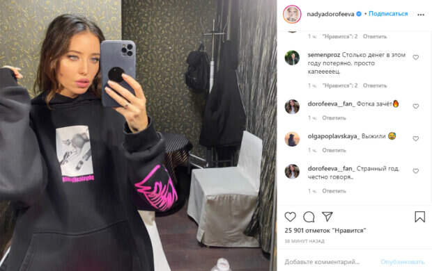 Позируя в свободной черной толстовке перед зеркалом, Надя распустила волосы и показала также легкий макияж с акцентом на розовые губы. В подписи же девушка отметила, что сейчас проходят последние дни 2020 года и у нее нет однозначного «фу» или «о, кайф то какой этот год» впечатлений в этот раз. «Было так много всего ... разного , страшного, опасного, волнительного, с налетами панических атак))но при этом - сколько любви , уюта , друзей, новых возможностей и МУЗЫКИ!! Я так рада, что была возможность наконец-то поработать над альбомом, сочинять и купаться в своих муках творчества ) Так хочу , чтоб вы это всё услышали скорее
