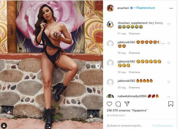 Игривая Ана развязала бретельки, еле удерживая грудь под тканью. Казалось, что сейчас модель отпустить полосочки ткани и покажет все свою красоту. Тонкие веревочки также были на плавках модели, и благодаря столь крохотным бикини не прикрывалось ничего лишнего. Кроме большой груди, нельзя также отвести взгляда от тонкой талии и упругого пресса знаменитости. Чери улыбалась, и прикрыв глаза, засветила длинные черные стрелки на веках. Волосы красотка распустила. В общем фото вышло очень ярким и жарким. "Тропический рай 💕💦 Поверь мне, ты хочешь увидеть весь новый эксклюзивный контент этой съемки!", - подписала фото модель. За три часа пост собрал более 100 тысяч лайков и много комментариев. Пользователи сети написали массу комплиментов, в том числе, что модель потрясающе выглядит. Напомним, Ана Чери позировала в черном бикини, соединенным с лифчиком тонкими завязками, девушка решила частично сбросить верх. При этом Ана прикрыла левую грудь цветками и приподняла стройную ножку вверх. В тон купальнику Чери надела ботинки на массивных каблуках. Ранее сообщалось, что Ана Чери на фото с подругами предстала в длинном платье, но с разрезом до бедра, и без белья. Девушки улыбались и позировали на улице перед фотографом. Напомним, загорелая Ана Чери едва втиснула пышные формы в тонкую сеточку А еще Politeka сообщала, что непревзойденная Ана Чери в чулках довела до безумия своими сочными формами Также Politeka писала, что раскованная Ана Чери показала неприличные места в прозрачном