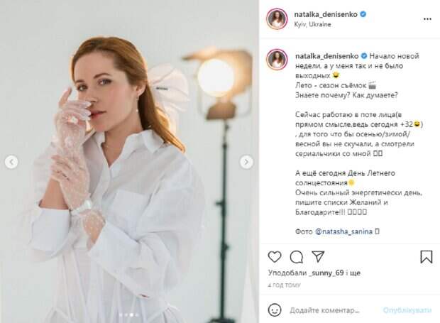 Так, недавно красотка показала в своем микроблоге роскошные кадры из новой фотосессии, на которых предстала в необычном нежном образе. На новых фотографиях Наталка запечатлена в светлой фотостудии с поставленным светом и профессиональным оборудованием. Перед камерой актриса появилась в интересном светлом наряде – это платье с прозрачным корсетом, сквозь которое просвечивается белое белье. Свой образ красотка дополнила прозрачными кружевными перчатками. Ее волосы собраны в аккуратную прическу и украшены белым бантом, а на лице легкий макияж, она загадочно смотрит в объектив. В подписи к фото Денисенко написала: "Начало новой недели, а у меня так и не было выходных. Лето – сезон съёмок. Знаете, почему? Как думаете? Сейчас работаю в поте лица (в прямом смысле, ведь сегодня +32), для того что бы осенью/зимой/весной вы не скучали, а смотрели сериальчики со мной. А ещё сегодня День Летнего солнцестояния. Очень сильный энергетически день, пишите списки Желаний и Благодарите!". Пользователи тут же принялись активно обсуждать новые снимки звезды, засыпая ее комплиментами: "Такая светлая и нежная", "Счастья вам", "Красавица", "Красотка, обожаю сериалы с вами", "Очень нежно", "Наталка, успехов тебе, будь счастлива", "Какая красивая", "Богиня красоты! ". Напомним, Звезда "Крепостной" Денисенко засветила содержимое своего полупрозрачного корсета: "Как вам?". Как сообщала Politeka, Денисенко после съемок в "Крепостной" откровенно высказалась о сериале: "В этот проект меня притянула...". Также Politeka писала, что Звезда "Крепостной" Денисенко в полупрозрачном топе впечатлила движениями на пилоне: "Я кручу!".