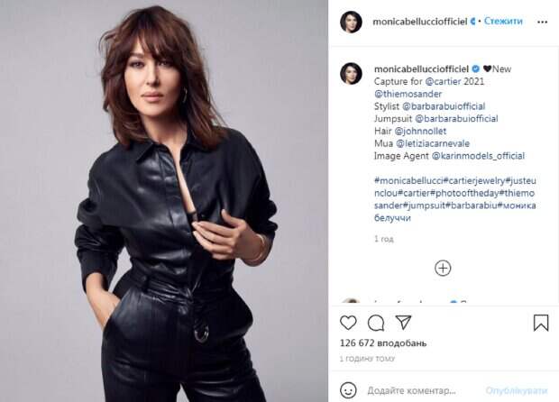 На новом фото на Монике можно увидеть черный кожаный комбинезон с ремешком, который прекрасно подчеркивает талию женщины. У нее элегантный макияж в нюдовых оттенках и каре с челкой. Также можно заметить, что модель дополнила образ серьгами-кольцами. В комментариях к новой фотографии пользователи отмечают, что Моника шикарно выглядит. "Моника, ты моя королева", "Красивая", "Люблю тебя очень", "Она - не просто красивое лицо, а еще и замечательная актриса, богиня", - пишут в комментариях. Моника Белуччи - всемирно известная итальянская модель. Ей сейчас 56 лет. Карьера Моники поражает своей насыщенностью - она снималась в десятках фильмов и участвовала во множестве показов мод и фотосессий. Известность в кино Беллуччи принесли такие фильмы как "Дракула", "Малена", "Матрица" и т.д. Напомним, что Моника Беллуччи окружила себя знойными красавцами, пустив в ход руки: "Ух, какая...". Как сообщала Politeka, Моника Беллуччи показала настоящую страсть, дав жару с толпой красавцев: "Лучше, чем Мэрилин Монро". Также Politeka писала, что Моника Беллуччи пленила пикантной позой, засветив кое-что интересное: "Шедевр"