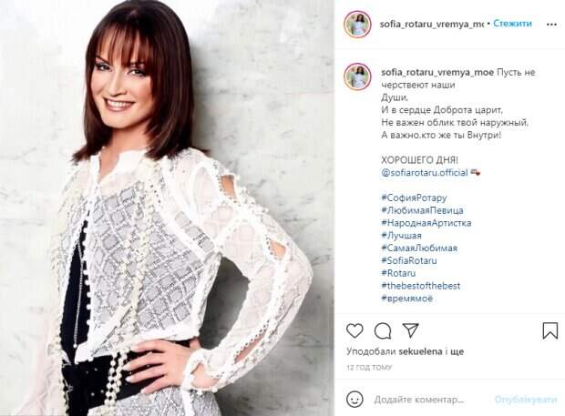 В соцсети Instagram есть множество фан-страниц, посвященных артистке, где пользователи обмениваются ее снимками. Так, недавно на одной из таких страниц опубликовали архивное фото легенды, на котором она выглядит просто потрясающе. Как видно, на этом снимке София Михайловна стоит в интересной позе у светлой стены и мило улыбается фотографу. Перед камерой она появилась в нарядном образе – на ней черное платье, поверх которого она надела белоснежную кружевную накидку, и все это дополнила массивным черным поясом. Волосы артистки аккуратно уложены, а на ее лице легкий макияж и нет даже следа морщин, она кокетливо улыбается в объектив. В подписи к фотографии Ротару говорится: "Пусть не черствеют наши Души, И в сердце Доброта царит, Не важен облик твой наружный, А важно, кто же ты Внутри! ХОРОШЕГО ДНЯ!". Такая публикация не осталась без внимания пользователей, снимок принялись активно обсуждать, засыпая артистку комплиментами в комментариях. "Невозможно смотреть без восхищения", "Красотка", "Чаровница", "Какая красивая", - пишут пользователи. Напомним, 50-летний единственный сын Ротару выдал правду о своем состоянии, показав анализы на гепатит: "Готов...". Как сообщала Politeka, Единственный сын Ротару показал свой почерневший и облезлый дом в Крыму: "Остались одни. ..". Также Politeka писала, Юная внучка Софии Ротару, собравшаяся замуж за миллионера, смутила видом без лифчика: "Отнеситесь серьезно к...".