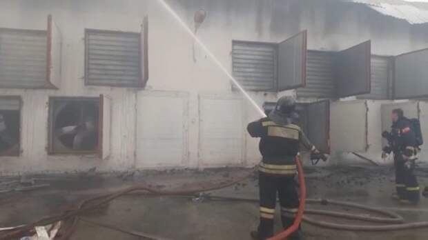 Крупный пожар в Челябинской области. Горит один из корпусов птицефабрики в поселке Рощино. Расчеты МЧС тушат огонь уже несколько часов. Пожарным удалось ликвидировать открытое горение, сейчас пламя полыхает внутри. Чтобы его погасить, спасатели вскрыли крышу корпуса. Всего огонь охватил площадь в четыре тысячи квадратных метров.