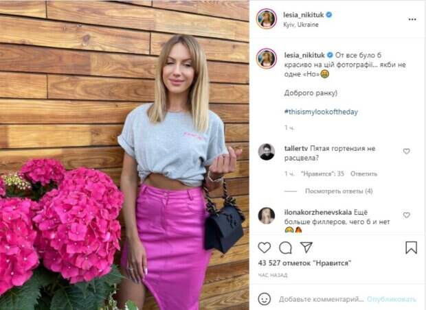 При этом любит Никитюк и подшутить над самой собой. В этот раз звезда позировала в розовой юбке и простой белой майке на фоне ярко-розовых распустившихся цветов. При этом сама Леся подметила: кое-что на этом кадре портит весь вид (взгляд Леси получился смазанным, что и насмешило сеть). «Вот все было бы красиво на этой фотографии, если бы не одно «но»», - заявила Никитюк. Вот как реагируют поклонники: «Пятая гортензия не расцвела?; Ещё больше филлеров, чего б и нет