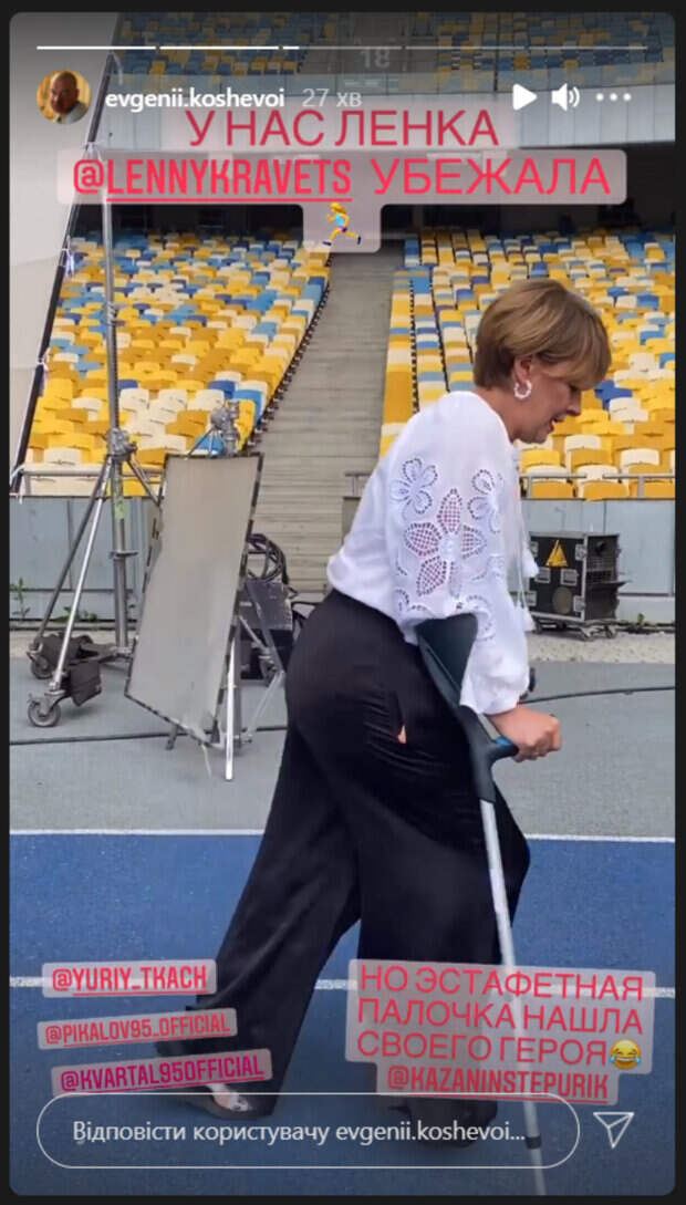 На свежих видео, которые опубликовал в Инстаграм ее коллега Евгений Кошевой, Елена в вышиванке и на костылях устроила настоящий забег на стадионе. Судя по видео, все кварталовцы принимали участие в съемках, приуроченных ко Дню независимости Украины. Елена устроила забег, а коллеги послушно следовали за ней. Закончилось все тем, что Степан Казанцев перегнал артистку, вырвав у нее из рук костыль. Все актеры рассмеялись и продолжили веселиться. «У нас Ленка убежала. Но эстафетная палочка нашла своего героя», - подписал видео Кошевой. Напомним, что Кравец появилась на сцене после несчастного случая, удивив внешним видом: "Леночка…". Как сообщала Politeka, покалеченная Кравец призналась, что с ней произошло: "Мы поехали в больницу, а там...". Также Politeka писала, что Кравец показала, как выросли ее младшие детки: фото первого юбилея.
