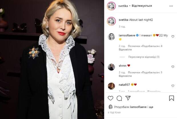 На новой фотографии Светлана запечатлена в интересной темной локации, перед камерой она появилась в нарядном образе. На ней очень необычная белоснежная блуза с кружевом и черный пиджак с яркой брошкой на воротнике. Волосы красотки аккуратно уложены, а на ее лице легкий макияж с красной помадой, она задумчиво смотрит в объектив. "О прошлой ночи", - подписала кадр Евдокименко. Напомним, Единственный сын Софии Ротару зацепил украинцев обращением: "Спешите жить, всё...". Как сообщала Politeka, Невестка Ротару засветила, как ведут себя на людях ее внук и внучка, кадры: "выглядел очень сердитым". Также Politeka писала, что Внучка Ротару в белом мини показала, как развлекалась в ночном Киеве: "О прошлой ночи".