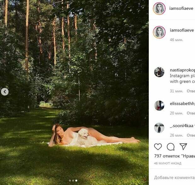 После этого модель позирует все в том же наряде, но уже возле машины марки Mustang, демонстративно распахнув кофту. Это стало причиной бурных комментариев со стороны ее поклонников. «потрясающая лошадка», «потрясающий вид! Красотка», «супер», «внеземной вид!», «тело само совершенство», - пишут они. До этого мы рассказывали, что модель Соня Евдокименко поразила откровенным образом на природе Красотка опубликовала в своем Инстаграм жаркие фото, сделанные во время отдыха на лужайке. Соня прилегла на подстилку, посадив рядом своего любимца - белого и милого песика. Модель надела белый купальник, который подчеркнул все ее изгибы. Пышная грудь, стройная талия, и длинные ноги - от этой фигуры никогда не оторваться. На одном из кадров Соня облокотилась об руку, а ее грудь в купальнике едва не выпрыгнула наружу. Модель смотрела в камеру и улыбалась. Вокруг красотки можно заметить высокие деревья с зелеными листьями. Напомним, внучка Ротару задрала футболку и без стеснения прогулялась по Киеву: "Фигура просто нереальная". Как сообщала Politeka, юная внучка Ротару слегка оголилась и устроила дикие танцы на камеру: бабушке такое и не снилось. Также Politeka писала, что озорная внучка Ротару приподняла кофту и показала, чем ее наградила природа.
