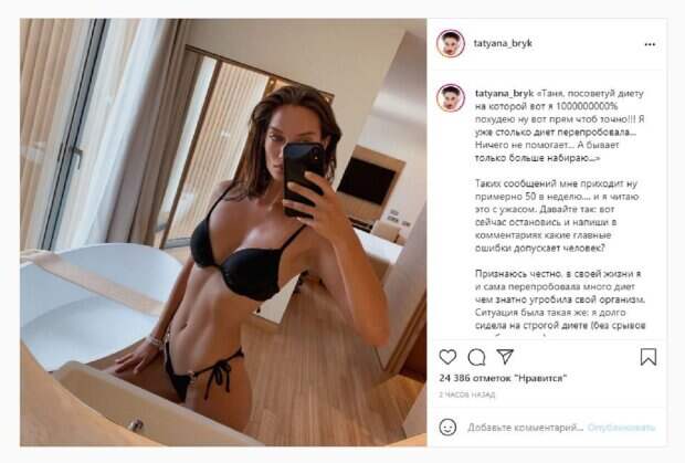 В этот раз девушка опубликовала фото в Инстаграм, на котором позировала в мини-бикини с трусиками на веревочках. Таня стояла в ванной комнате, демонстрируя фигуру перед зеркалом. "Таня, посоветуй диету на которой вот я 1000000000% похудею ну вот прям чтоб точно!!! Я уже столько диет перепробовала... Ничего не помогает... А бывает только больше набираю..." Таких сообщений мне приходит ну примерно 50 в неделю.... и я читаю это с ужасом. Давайте так: вот сейчас остановись и напиши в комментариях какие главные ошибки допускает человек? Признаюсь честно, в своей жизни я и сама перепробовала много диет чем знатно угробила свой организм. Ситуация была такая же: я долго сидела на строгой диете (без срывов не обходилось), как только возвращалась к нормальному питанию- сразу +3-5 кг на весах...", - написала Брык. Фанаты поставили более 20 тысяч лайков и написали комментарии: "Отличные слова, моя ошибка была-питание на 600-700 ккал", "Таня, ну невероятная же", "Очень правильные слова". Напомним, Брык из "Супер Топ-модель по-украински" в коже устроила шалости с красавчиком Также Politeka сообщала, что Брык из "Супер Топ-модель по-украински" после нервного срыва решила кардинально поменять стиль А еще Politeka писала, что Брык из "Супер Топ-модель по-украински" поразила фигурой и откровением