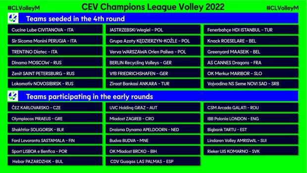 Также приглашения получили итальянская «Модена» и польская «Скра». Отметим, что в главном европейском турнире в волейбольной Лиге чемпионов от России сыграют московское «Динамо», петербургский «Зенит» и новосибирский «Локомотив». В женской части турнира заявлены казанское «Динамо-Ак Барс», московское «Динамо» и калининградский «Локомотив». Ранее стало известно, что главным тренером казанского «Зенита» стал Алексей Вербов. Участники мужской Лиги чемпионов по волейболу. Фото: cev.euУчастники женской Лиги чемпионов по волейболу. Фото: cev.eu