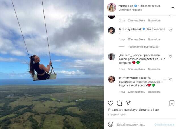 Ксения Мишина покорила украинцев полетом на качели Главная "холостячка" страны Ксения Мишина продолжает радовать поклонников яркими снимками с Доминиканы, где они с Александром Эллертом, покорившим сердце украинской актрисы, отдыхают вместе с детьми. Как сообщает Politeka.net, на своей странице в Instagram Мишина показала фото "полета" на качели на огромной высоте.