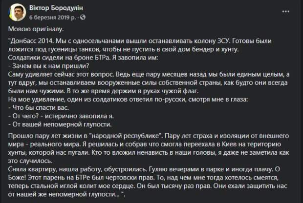 Жительница Донбасса пересмотрела свой взгляд на "вторжение" ВСУ Как передает Politeka.net, ее слова привел Виктор Бородулин на своей страничке в Facebook. "Донбасс 2014. Мы с односельчанами вышли останавливать колону ВСУ. Готовы были ложится под гусеницы танков, чтобы не пустить в свой дом бендер и хунту.