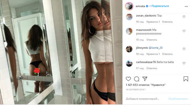 На странице девушки в Инстаграм больше всего комментариев собирают посты, на которых она в провокационных образах – мини-бикини, кружевном белье или коротеньких топах, оголяющих грудь. Ратаковски сверкает на кадрах загорелым телом и ракурс для этого подбирает всегда самый удачный. На одном из таких фото Эмили в белом топе, подчеркивающим грудь, показала себя с разных сторон, повернувшись к зеркалу и засветив при этом также и ягодицы. «Довольно, это прекрасно» «Красивое зеркальное фото