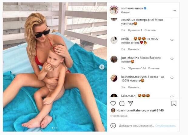 В этот раз тоже не обошлось без предположений, ведь Романова в Инстаграм показала подросшего сына. Красотка сидела в купальнике на полотенце, обнимая раздетого маленького ребенка. Девушка опубликовала несколько фото, показав, как сильно любит Мартина (так зовут мальчика). "Моя любовь", - написала Романова под фото. Фанаты поставили более 6 тысяч лайков и написали комментарии: "На Макса Барских похож", "Какие вы красивые", "Ну какие классные, парочка", "Мама и сыночек", "Мама и любимый сыночек, класс", "Какие хорошие, семейные фотографии! Миша умничка". Напомним, подруга Макса Барских в слишком коротком платье потрясла видом за кулисами "Співають всі" А еще Politeka сообщала, что подруга Макса Барских в экстра-мини впечатлила чересчур глубоким декольте Также Politeka писала, что подруга Макса Барских спровоцировала дерзким образом без лишней одежды