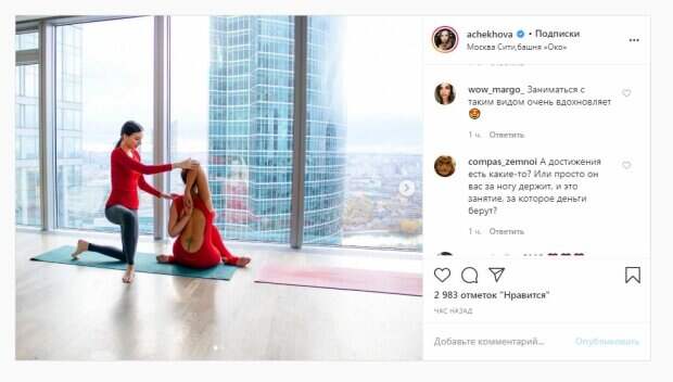 Известная телеведущая Анфиса Чехова показала, как занимается йогой На фото красотка сидит на коврике в красном комбинезоне с открытой спиной. Инструктор рядом помогал держать руки, пока Анфиса выполняла нужные действия. Об этом пишет Politeka.net со ссылкой на страничку знаменитости. На втором фото Чехова уже была в другом костюме и лежала на боку.