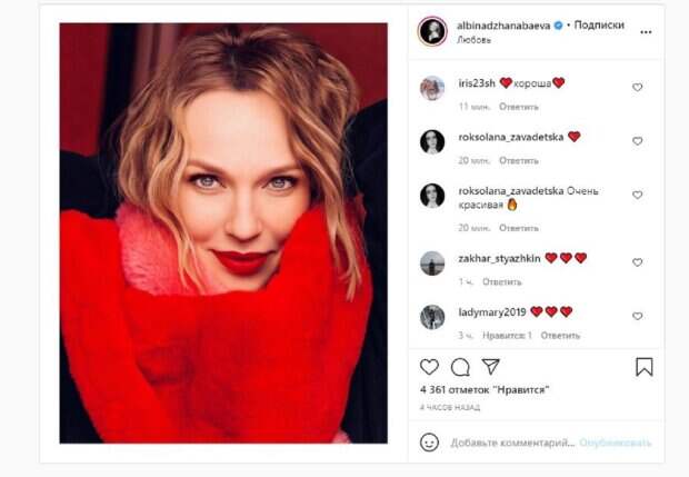 Известная певица Альбина Джанабаева, жена Валерия Меладзе, показала свежий образ На фото Альбина показала только свое лицо. Красотка прикрылась красным шарфом, как и накрасила губы в аналогичный цвет. Джанабаева оставила волосы распущенными, а смотрела прямо в камеру, хвастаясь роскошной внешностью.