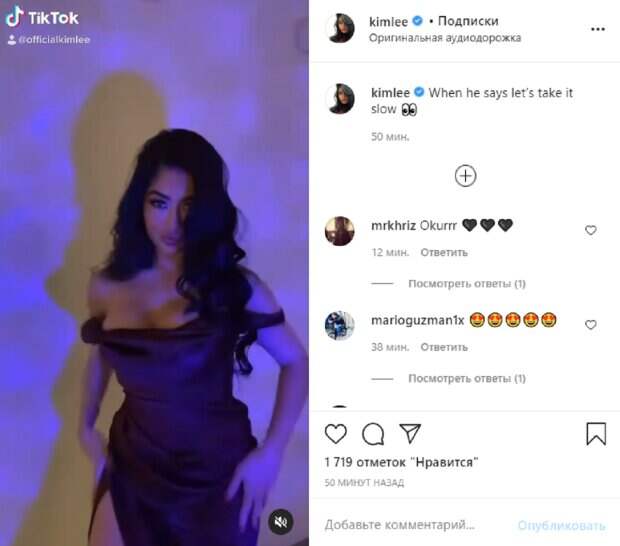В этот раз красотка решила подразнить публику двигаясь под музыку. Ким Ли нарядилась в вечернее платье с открытыми плечами, которое открывало взоры на внушительное декольте красотки. Модель обольстительно виляла бедрами, поднимала руки и запускала их в распущенные волосы, а также гладила свои пышные ягодицы, доведя до экстаза мужскую половину своих поклонников. «Когда он говорит, давай не торопится», - загадочно подписала видео модель. За несколько часов кадры собрали тысячи лайков и много комментариев. Поклонники написали красотки восторженные отзывы о ее пластике и роскошном образе. Некоторые отметили, что на эти движения можно смотреть вечно. "Кто сказал, что он лжет