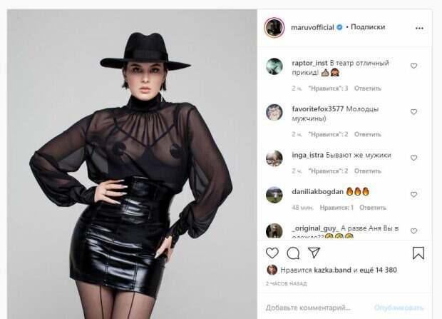 net со ссылкой на страничку знаменитости. "Бомбический прикид. Дорогие мадам! Моя команда подбила статистику и чаще всего мою одежду заказывают мужчины для своих дам, так что задумайтесь", - подписала фотографию звезда. Фанаты поставили более 14 тысяч лайков и написали комментарии: "Просто идеальная", "Мой кумир и идеал", "В театр отличный прикид!", "Агрессивно", "Аня, зачем ты так с нами??? !!!!", "Бомбическая девушка", "Как будто у Ани когда-то были НЕ бомбические наряды - всегда", "Обязательно закажу!!!", "Лошадка мощная", "Очень красиво и стильно", "Очень красивая девчонка !", "Аня, это чувство, когда мы в одном городе", "Или дамы с картами мужей", "Возможно мужчины для себя покупают". Сообщалось, что 28-летняя украинская певица Анна Корсун, известная как MARUV, предстала перед публикой в новом соблазнительном образе. На фотографии MARUV оделась в черный обтягивающий наряд, из-за которого взгляд фанатов поневоле задерживается на крутых бедрах певицы. Полупрозрачная блузка позволяет оценить ажурный лифчик Анны. Напомним, MARUV в полупрозрачном наряде переплюнула развратными танцами саму Cardi B А еще Politeka писала, что разгоряченная MARUV изогнулась в облегающем боди, показав сладкие места Также Politeka сообщала, что игривая MARUV в одном купальнике показала формы со всех ракурсов