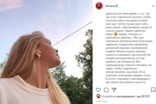 В этот раз выполнила даже больше))», - отметила певица. По ее словам, она посетила мобильный спектакль. Для этого нужно было включить его в наушниках и следовать инструкциям. «Мы под огромным впечатлением) благодаря идеально созданному материалу, актерской озвучке и интересной подаче. Можно ходить одному, можно в компании, где количество людей неограниченно) это так удобно) так интересно!», - призналась Брежнева. В комментариях ей оставили массу приятных слов по поводу ее внешнего вида. «Волшебная», «Чудесная», «Супер», «Обворожительная вы наша Верочка!», «VERA вы эталон женственности и красоты. Любим вас», «Вера, какая же Вы красивая и вдохновляющая!!! Заряжаете позитивом», - пишут пользователи сети. Напомним, что Брежнева развлеклась с Меладзе в машине, видео: "Вот это качнули". Как сообщала Politeka, Брежнева не смогла скрыть округлившийся животик в облегающем платье: в Сети заволновались. Также Politeka писала, что Веру Брежневу в парике из бисера заподозрили в плагиате: «У Бузовой стянула идеи…».