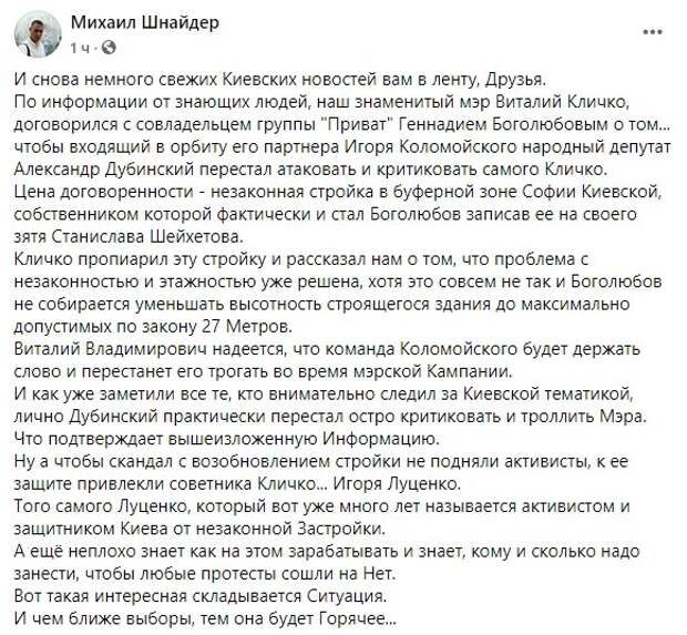 Об этом сообщил блогер и журналист Михаил Шнайдер. “По информации от знающих людей, наш знаменитый мэр Виталий Кличко, договорился с совладельцем группы "Приват" Геннадием Боголюбовым о том... чтобы входящий в орбиту его партнера Игоря Коломойского народный депутат Александр Дубинский перестал атаковать и критиковать самого Кличко. Цена договоренности - незаконная стройка в буферной зоне Софии Киевской, собственником которой фактически и стал Боголюбов записав ее на своего зятя Станислава Шейхетова”, - написал Шнайдер. По его словам, несмотря на заверения Кличко о том, что стройка теперь законна, Боголюбов не планирует снижать ее этажность. “Кличко пропиарил эту стройку и рассказал нам о том, что проблема с незаконностью и этажностью уже решена, хотя это совсем не так и Боголюбов не собирается уменьшать высотность строящегося здания до максимально допустимых по закону 27 Метров”, - отметил блогер. Он поделился информацией о том, что Кличко надеется, что команда Коломойского будет держать слово и перестанет его трогать во время мэрской кампании. “И как уже заметили все те, кто внимательно следил за Киевской тематикой, лично Дубинский практически перестал остро критиковать и троллить Мэра. Что подтверждает вышеизложенную Информацию”, - констатировал журналист. Кроме того он сообщил, что во избежание протестов активистов к защите незаконной стройки подключили экс-нардепа Игоря Луценко. “Чтобы скандал с возобновлением стройки не подняли активисты, к ее защите привлекли советника Кличко... Игоря Луценко. Того самого Луценко, который вот уже много лет называется активистом и защитником Киева от незаконной Застройки. А ещё неплохо знает как на этом зарабатывать и знает, кому и сколько надо занести, чтобы любые протесты сошли на Нет. Вот такая интересная складывается Ситуация. И чем ближе выборы, тем она будет Горячее”, - резюмировал Михаил Шнайдер.