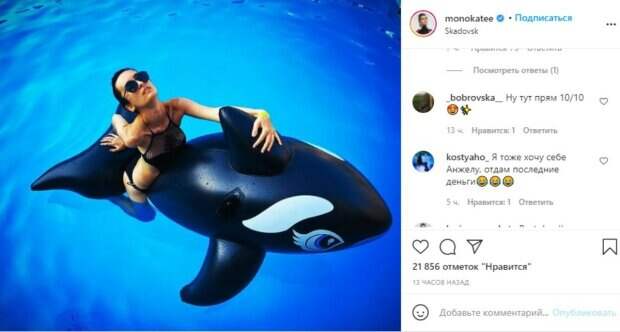 На новом кадре Катерина смело позировала перед камерой в бассейне сидя на надувной касатке. Насладиться отдыхом певица решила в черном купальнике с вставками из крупной сетки. На кадре видно, насколько у исполнительницы стройная фигура – подтянутый пресс, красивые ключицы и хрупкие руки. "Я и Анджела", — с юмором подписала пост певица. Фанаты поспешили похвалить звезду: «Какая Анжела, когда там такая красивая Екатерина