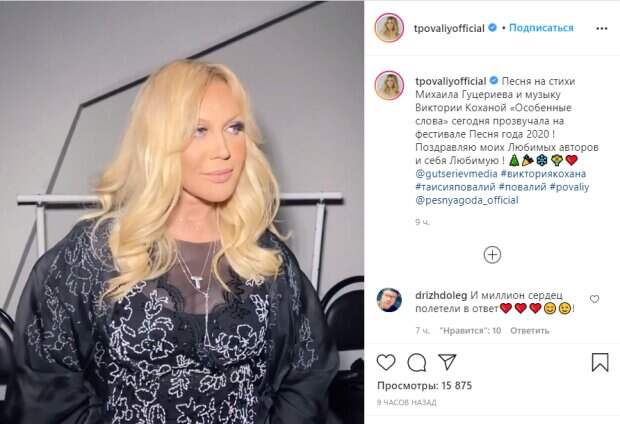 ", - сообщила певица в подписи к посту. На опубликованных кадрах Повалий предстала в черном платье и в полном "боевом раскрасе", но внимание ее поклонников привлекла внешность певицы. Многие удивились тому, как изменилась их любимица. "До Доннателлы Версаче осталось 2-3 вмешательства! Финишная прямая. А ведь вы были эталоном красоты в 90ые.. зачем? Здоровья Вам!", "Она уже на Пугачеву похожа", "Она на какого-то мужчину похож", "Оксана Байрак одно лицо", "А мы вас самую любимую поздравляем Таечка", "Как же радостно за Вас, Таечка! Примите и от нас самые теплые и искренние поздравления! Любим!!! Ждём новых творений и поводов порадоваться за Вас!!!", - писали в комментариях под постом певицы. Напомним, что растрепанная Повалий откровенно рассказала о болезни члена семьи: "Перестала есть сама, протираем еду через сито и...". Как сообщала Politeka, 55-летняя Таисия Повалий ошарашила внешностью куклы Барби: «Другой человек». Также Politeka писала, что скандальная Повалий осмелилась показать, как выглядит на самом деле: "Что с лицом?".