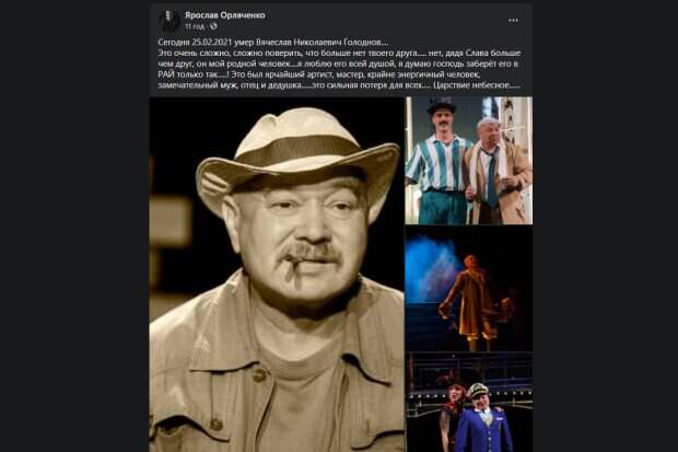 Ушел из жизни российский актер Вячеслав Голоднов Как передает Politeka.net, трагическую новость сообщил его коллега Ярослав Орляченко на своей страничке в Facebook. Его сердце остановилось 25 февраля на 73 году жизни. "Это очень сложно, сложно поверить, что больше нет твоего друга..... нет, дядя Слава больше чем друг, он мой родной человек.