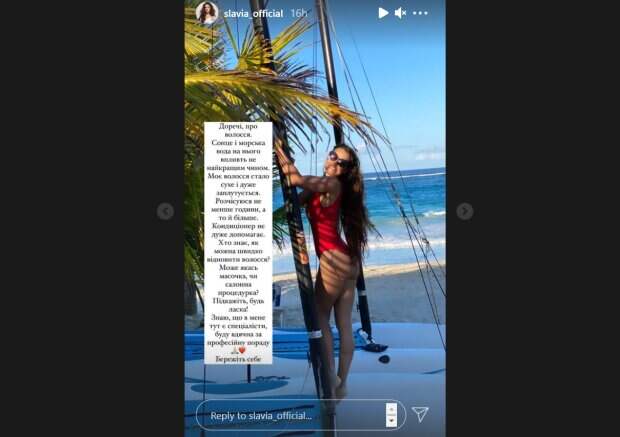 SLAVIA забралась на мачту надувного судна, которое оставили у пальм на пляже, и сверкнула счастливой улыбкой. "Кстати о волосах. Солнце и морская вода на него влияют не самым лучшим образом. Мои волосы стали сухими и очень запутываются. Расчесываются не менее часа, а то и больше. Кондиционер не очень помогает. Кто знает, как можно быстро восстановить волосы? Может какая-то масочка или салонная процедурка? Подскажите пожалуйста. Знаю, что у меня тут есть специалисты, буду благодарна за профессиональный совет. Берегите себя", - подписала кадр жена Михаила Хомы. Известно, что Ярослава встретила Новый год на отдыхе в Доминиканской Республике, куда поехала без мужа. Она регулярно делится курортными кадрами, а недавно выложила пикантный снимок с пляжа, на котором предстала в таком же красном боди с вырезом на спине. Девушка удобно расположилась на песке чтобы тень от пальмового листа упала на нее красивым контуром. Напомним, что жена DZIDZIO в бикини взбудоражила смелыми позами на пляже: "Недаром муж держал от всех подальше". Как сообщала Politeka, роскошная жена DZIDZIO оседлала жеребца, подразнив экзотическими развлечениями: «Я в восторге…». Также Politeka писала, что жена DZIDZIO в неприличном мини кайфонула от экстрима, кадры развлечений: «Настоящий драйв».