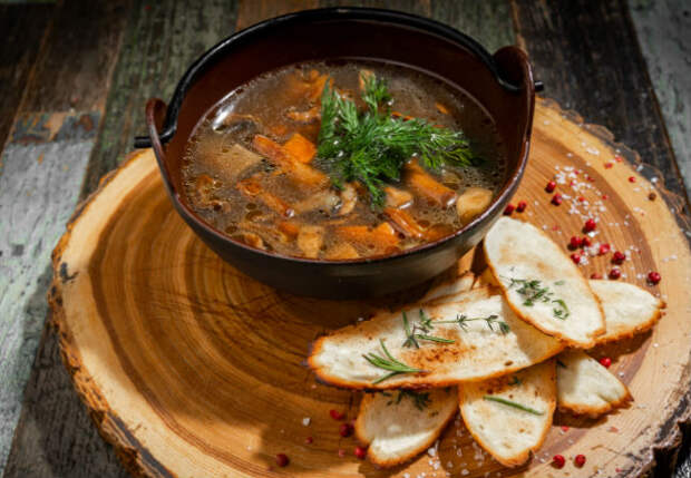 Насыщенная, сытная, ароматная грибная похлебка имеет все шансы стать любимым супом для всей семьи. Готовится и вовсе без мяса, да и времени занимает совсем немного. На три литра воды нам понадобится 100 граммов сухих белых грибов, 300 граммов шампиньонов, 200 граммов репчатого лука, морковь, картофель, растительное и сливочное масло, петрушка, укроп, лавровый лист.